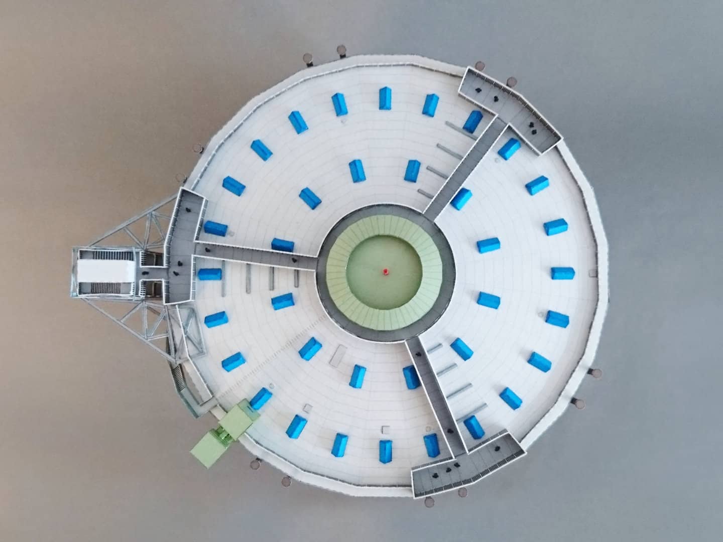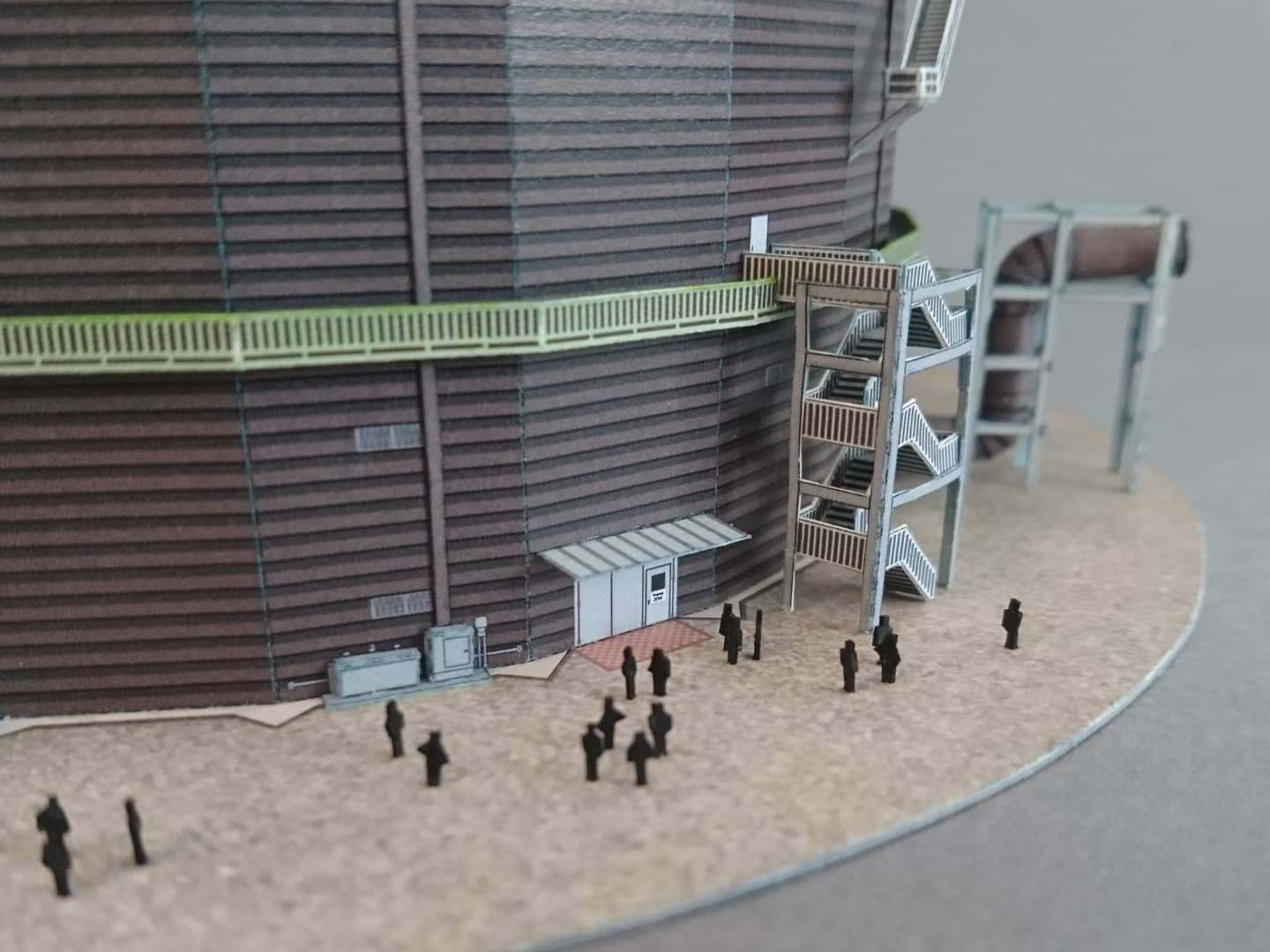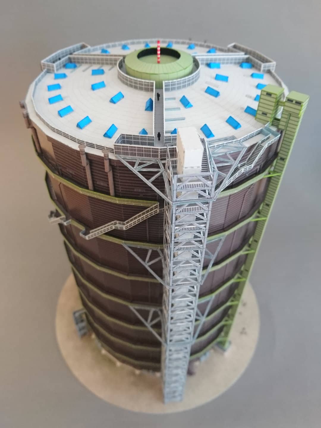 Winzige Silhouetten beleben das Modell – und verweisen auf hunderttausende Menschen, die jedes Jahr den Gasometer besichtigen.
