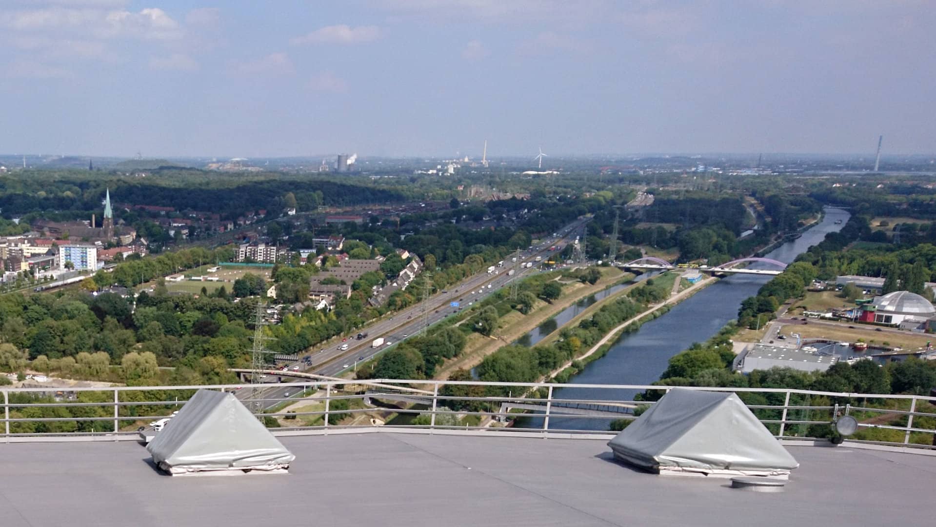 Als der Oberhausener Gasometer am 15. Mai 1929 in Betrieb ging, war an einen Panoramablick vom Dach des Gebäudes noch nicht zu denken: Staub, Asche und Ruß trübten die Luft über dem Ruhrgebiet, das seinerzeit von Kohle und Stahl lebte. In zweijähriger Bauzeit hatte die Maschinenfabrik Augsburg-Nürnberg AG (MAN) den damals größten Scheibengasbhälter Europas auf dem Gelände der Gutehoffnungshütte errichtet. Das in den Hochöfen entstehende Gichtgas blieb fortan nicht mehr ungenutzt, sondern konnte in dem 350.000 m3 fassenden Zylinder gespeichert und zum Heizen der Koksöfen verwendet werden.