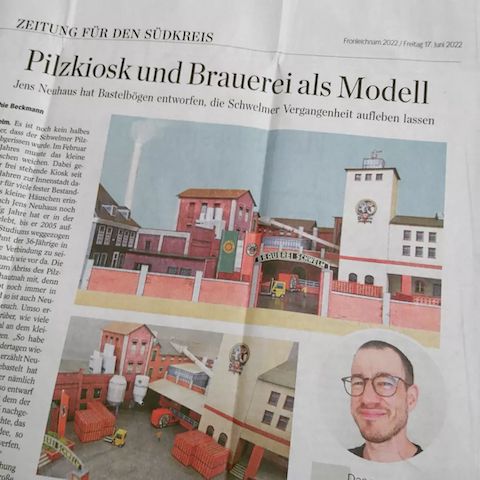 Motiviert von der starken Resonanz in den sozialen Medien, suchte ich umgehend nach einem »Anschlussprojekt«. Umfangreicher sollte es sein und stadtgeschichtlich bedeutsamer. Schnell fiel meine Wahl auf die ehemalige Brauerei Schwelm, deren Abriss sich im Juni 2022 zum zehnten Mal jährte. Nach vielen Monaten der Recherche, Konstruktion und Ausarbeitung war es pünktlich zum Jahrestag soweit: Die einstige Brauerei, von vielen Schwelmer:innen noch immer sehr geliebt, erschien als zweites Papierdenkmal. Seither entstehen in unregelmäßigen Abständen immer wieder neue Modellbögen, die ich zum kostenfreien Download anbiete.