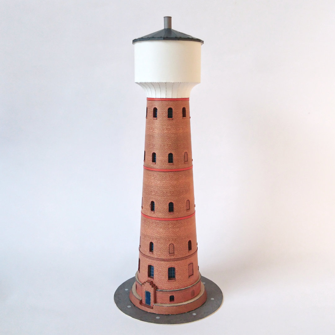 Das Modell zeigt den Kalker Wasserturm in saniertem Zustand. Zwei Eingänge führen ins Erdgeschoss, das zu einer Nutzfläche umgebaut wurde.